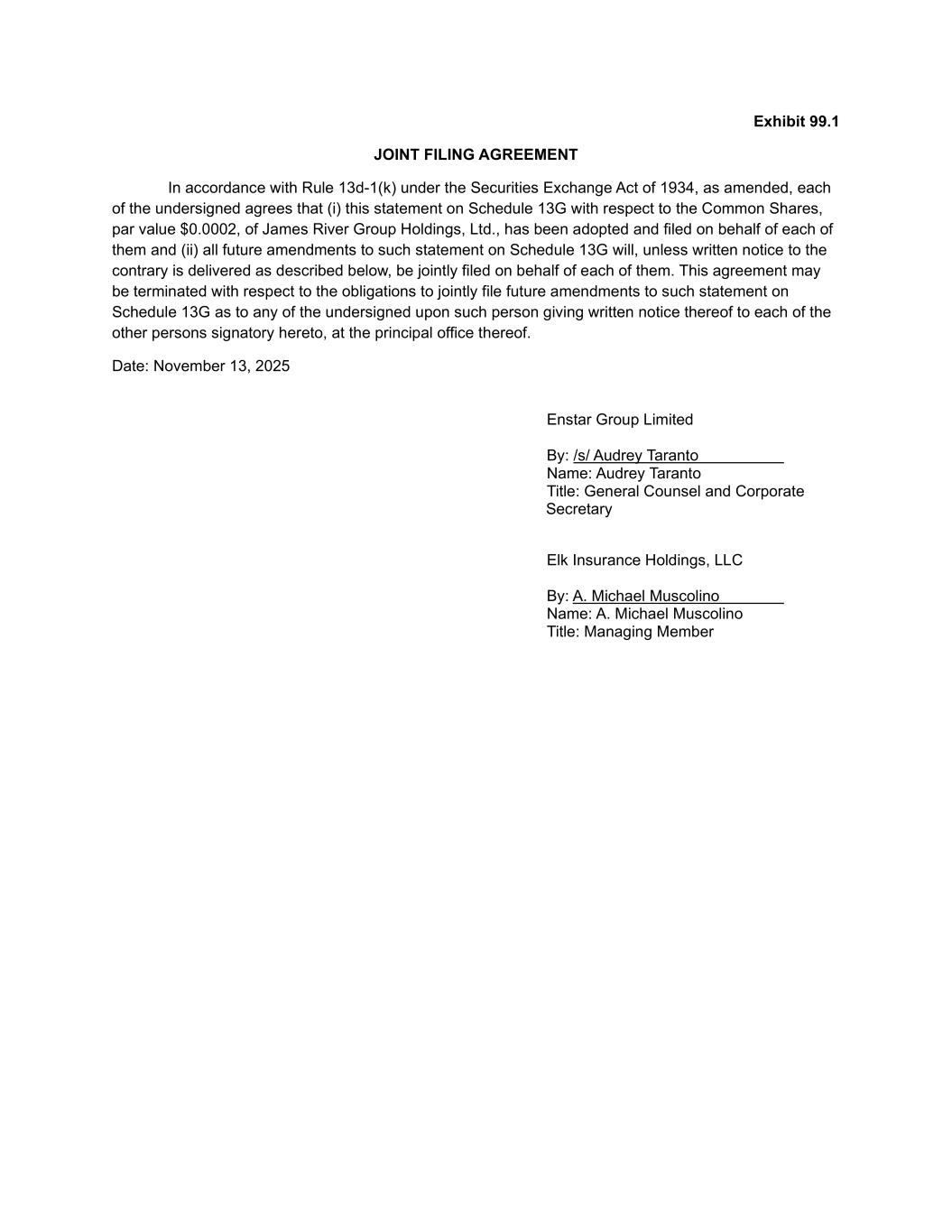 This Schedule 13G is being jointly filed by Enstar Group Limited ("Enstar") and Elk Insurance Holdings, LLC ("Elk Insurance"). | |